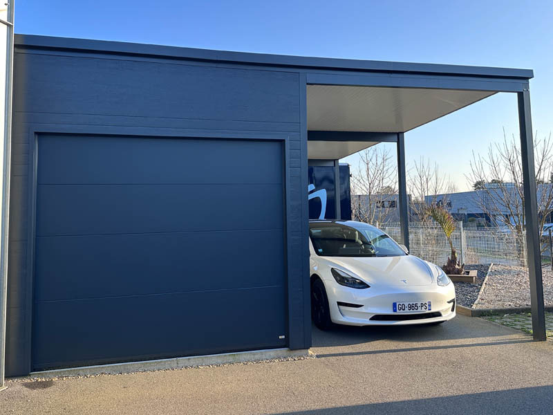 Carport garage alu 4.00 x 5.10 m avec porte sectionnelle fermé lames bois